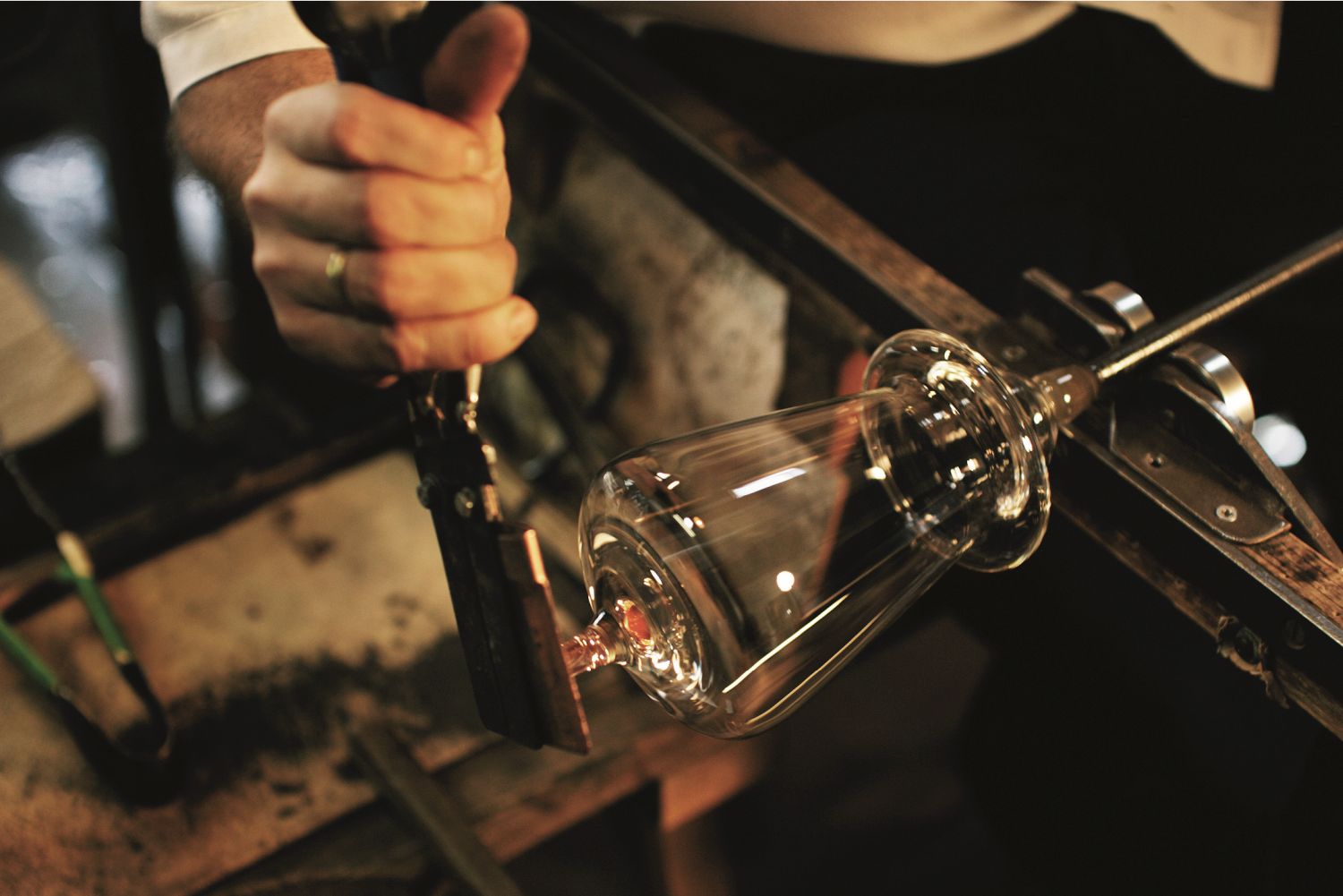 Wer einmal die traditionelle Fertigung eines Glases erlebt hat, versteht die Faszination dieses uralten Handwerks. Das Zusammenspiel aus Feuer, glühender Masse und feinmechanischer Präzision wirkt wie ein Ritual. Trotz einfachster Werkzeuge erreichen die Glasmachermeister dabei eine Genauigkeit, die moderne Maschinen bis heute nicht reproduzieren können.